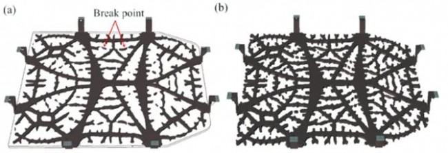 ▲電池托盤拓撲優(yōu)化結(jié)果:(a)調(diào)整前;(b)調(diào)整后