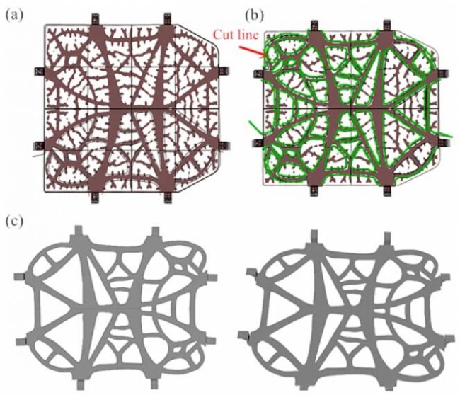 ▲拓撲優(yōu)化模型的重構(gòu):(a)圖像和模型的導(dǎo)入;(b)切割線的劃分;(c)重構(gòu)效果。