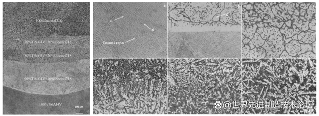 △梯度涂層宏觀金相圖和各區(qū)域顯微組織(a→e 由 TC4 基材至頂部 IN718 涂層)