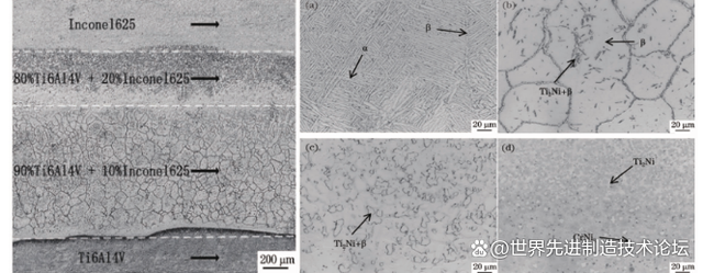 △梯度涂層宏觀金相圖和各區(qū)域顯微組織(a→d 由 TC4 基材至頂部 IN625 涂層)