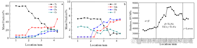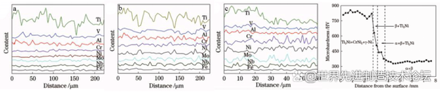 △成分變化以及顯微硬度變化(a、b、c 依次為底→頂三個結(jié)合區(qū)域的元素變化)