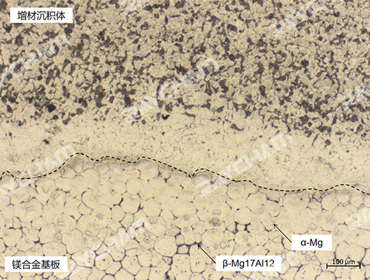 金相觀察結(jié)果:顯微組織為離異共晶組織,主要由固溶體α-Mg與晶間離異的共晶β-Mg17Al12相組成,呈不規(guī)則分布,主要在晶界附近。在電弧增材特殊的熱輸入影響下,析出的β-Mg17Al12相尺寸、分布與鑄態(tài)金屬不同,會有更加細(xì)小的α固溶體,同時(shí)晶界附近存在細(xì)小均勻分布的連續(xù)析出β相,產(chǎn)生彌散強(qiáng)化效果,從而提高力學(xué)性能。