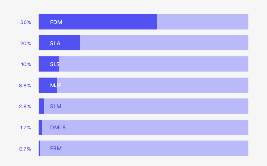 不出所料,F(xiàn)DM(熔融沉積成型)仍然是參與調(diào)查的人最常見的選擇,有56%的人表示這是他們最常用的增材制造方法。此外,后處理選項的進(jìn)步正在幫助推動3D打印的采用。