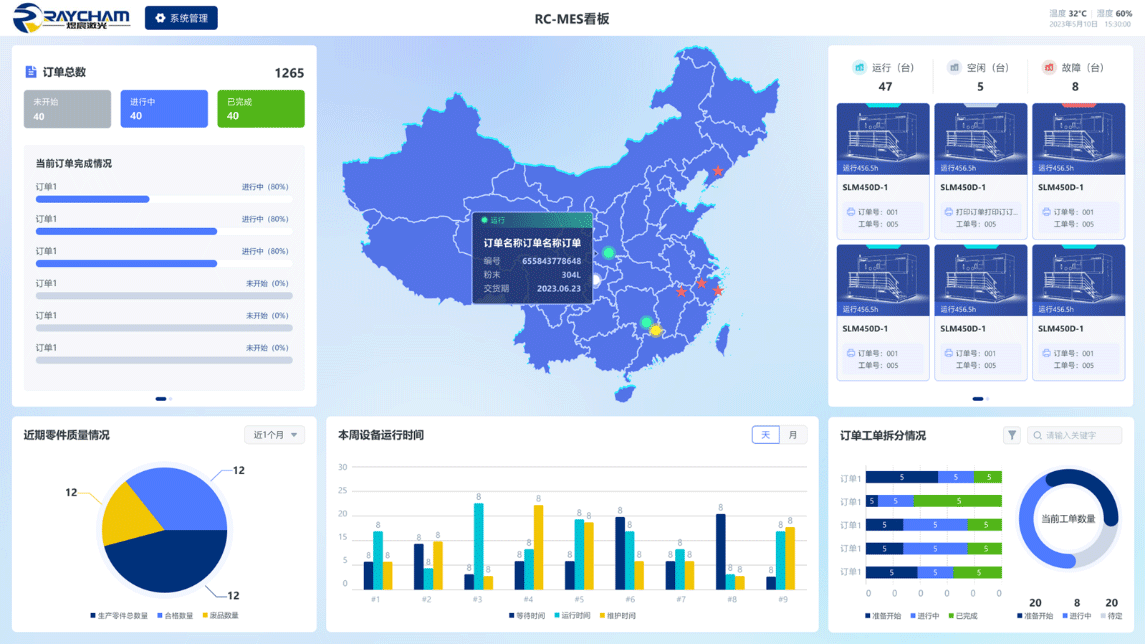RC-MES的各個(gè)功能模塊內(nèi)置了多種信息匯聚的報(bào)表,管理者可以一目了然地了解當(dāng)前工廠的訂單完成情況、工單排產(chǎn)情況、設(shè)備運(yùn)行情況、耗材庫存情況等基本信息,大屏看板更是可以對當(dāng)前廠區(qū)的運(yùn)行情況進(jìn)行實(shí)時(shí)更新展示,為管理者提供決策支持。